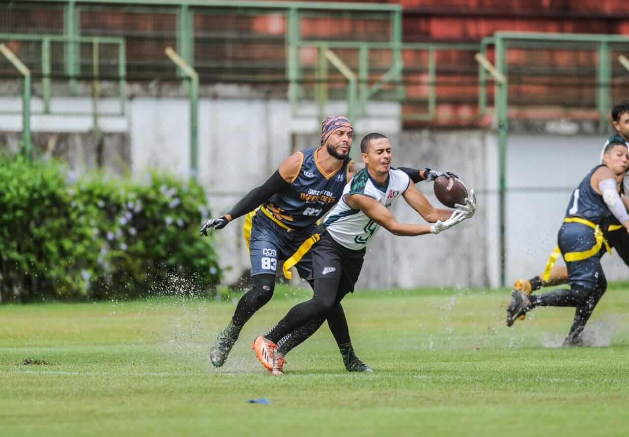 Jogadores do Locomotiva e Imperadores (uniforme preto) disputam bola em partida de Flag Football, modalidade olímpica nos Jogos de Los Angeles 2028 Foto: Daniel Braga